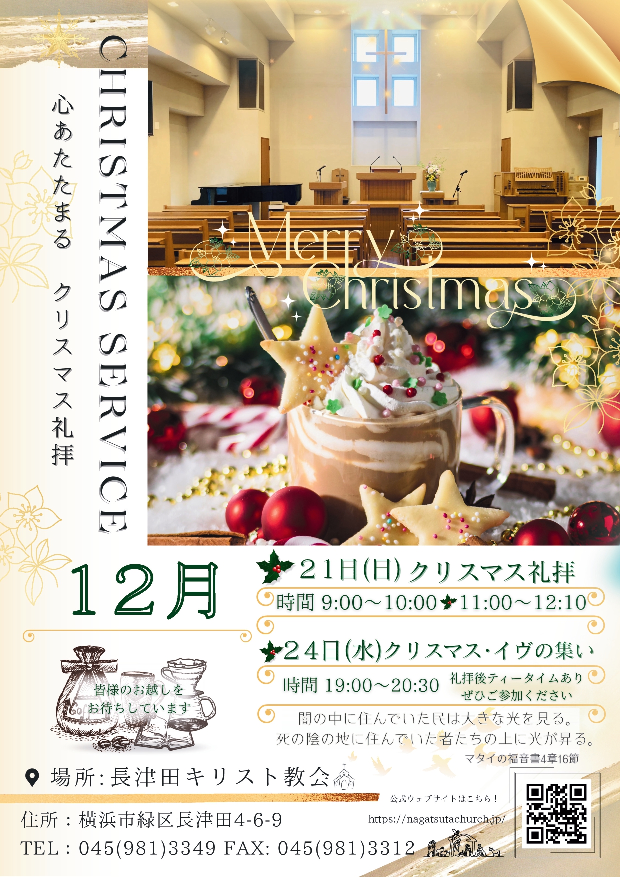 12月22日(日)にクリスマス礼拝を行います。 12月24日(火)にクリスマス・イヴの集いを行います。 皆様のご来会をお待ちしております。 |