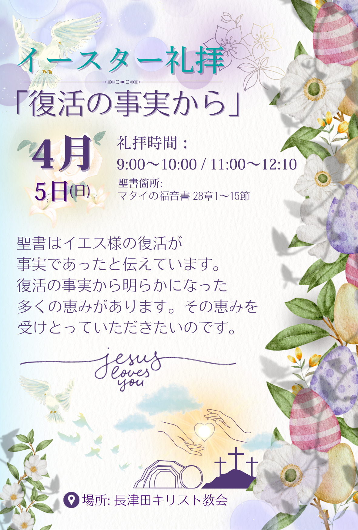 3月31日(日)にイースター礼拝を行います。 上記の案内をご覧ください。 配信も行います。 |