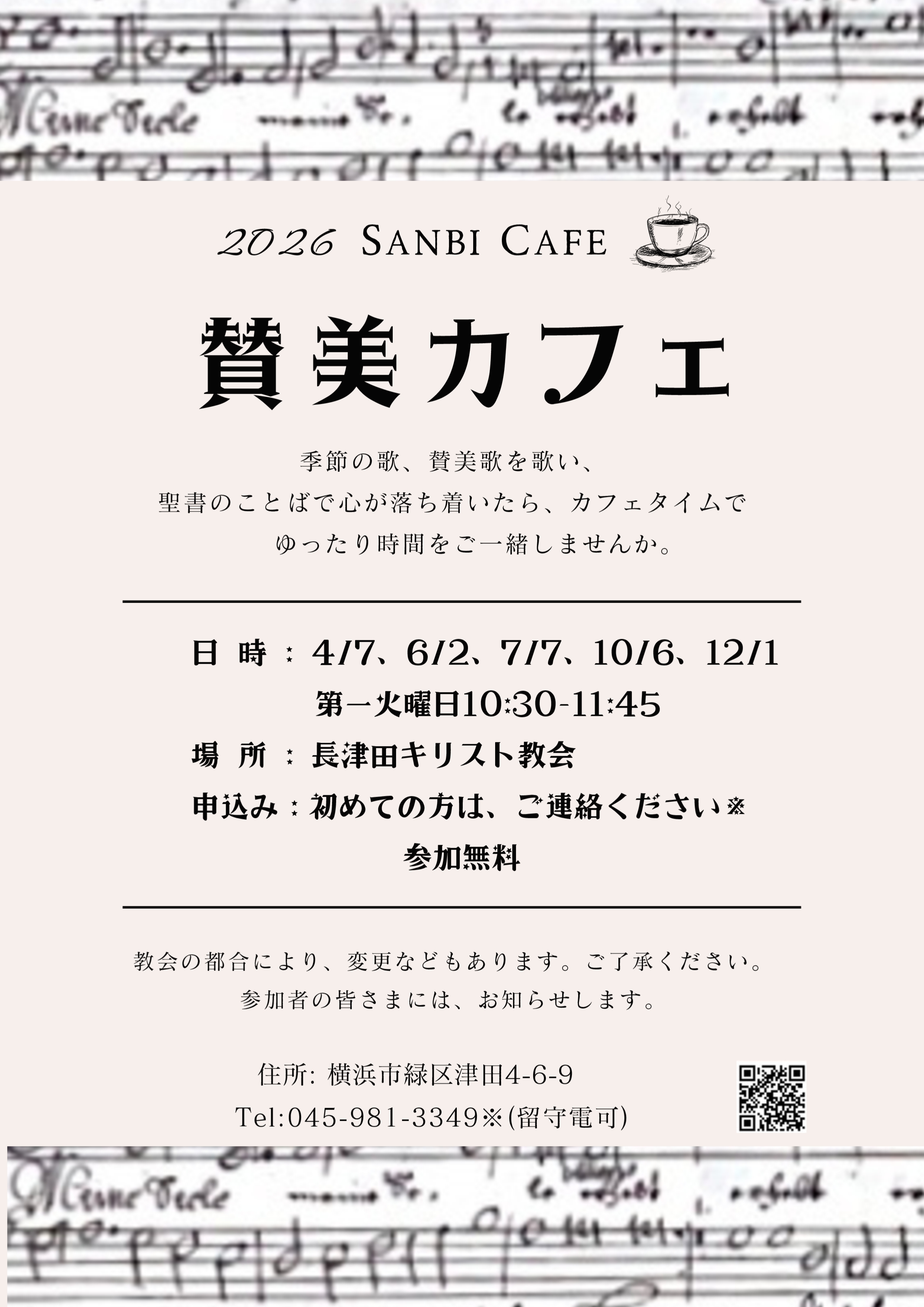 今年も賛美カフェを行います。 今年はカフェタイムを再開します。 参加無料です。ぜひご参加ください。 |