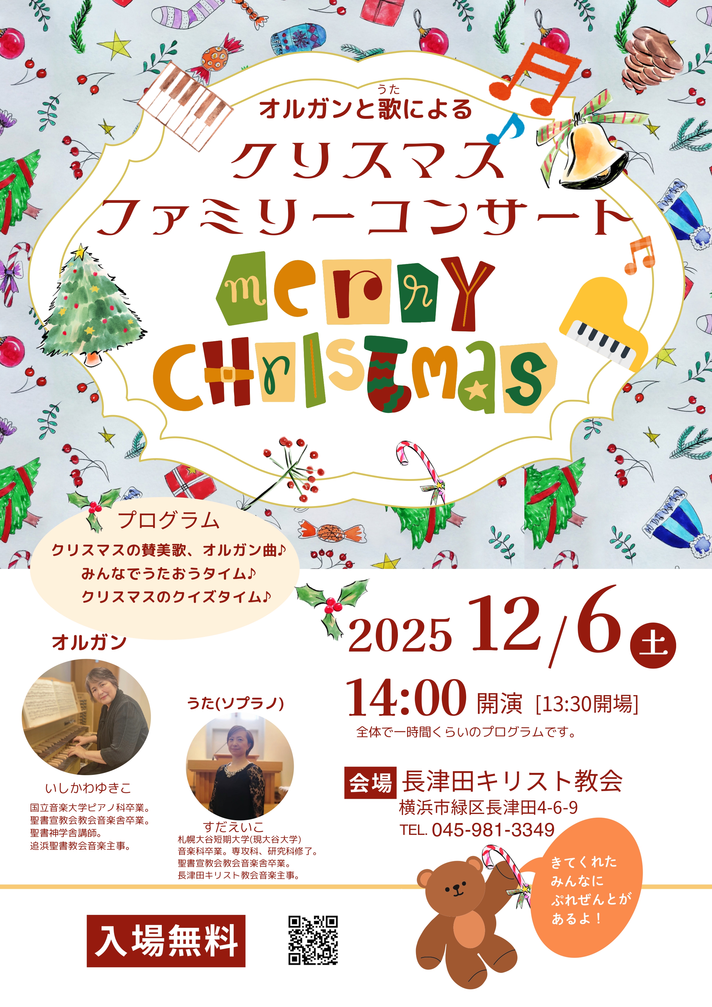12月6日(土)午後2時からクリスマス ファミリーコンサートを行います。 お子さんもご一緒にお越しください。 詳しくは上記をご覧ください。 |